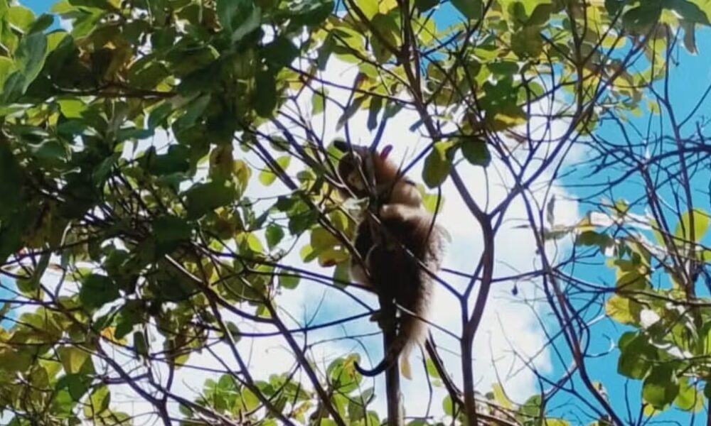 De acordo com os Bombeiros, o animal estava em cima de um cajueiro no quintal de uma residência e corria risco de ser atacado pelos cães da casa.