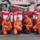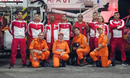 Quatro dos nove bombeiros militares de Sergipe e um cão farejador, que estão a caminho do Rio Grande do Sul, para ajudar no...
